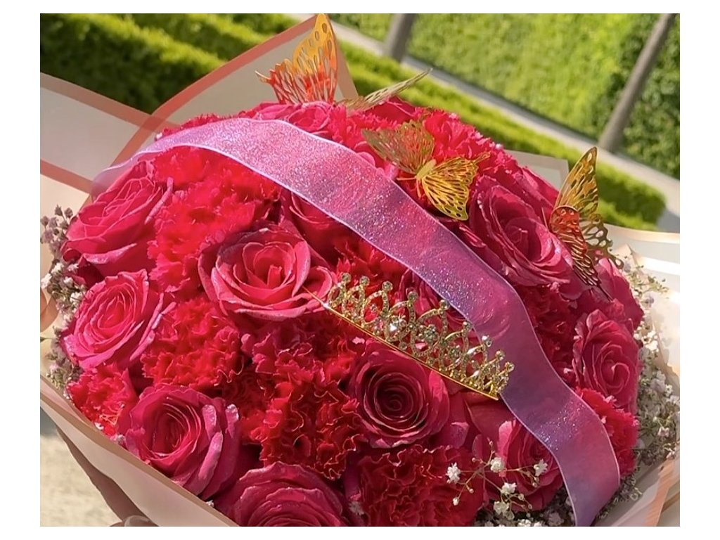 The bouquet is adorned with an elegant golden crown and butterflies, adding an exclusive and luxurious touch. Whether it’s a romantic evening, a special celebration, or just a way to brighten someone’s day, this bouquet is always the perfect choice.